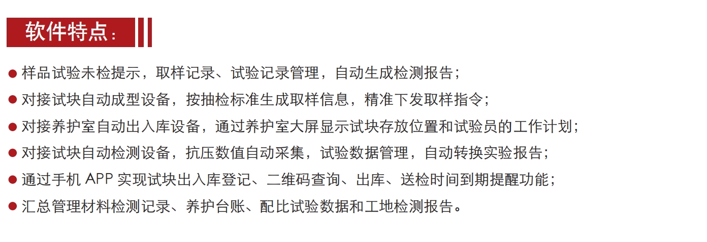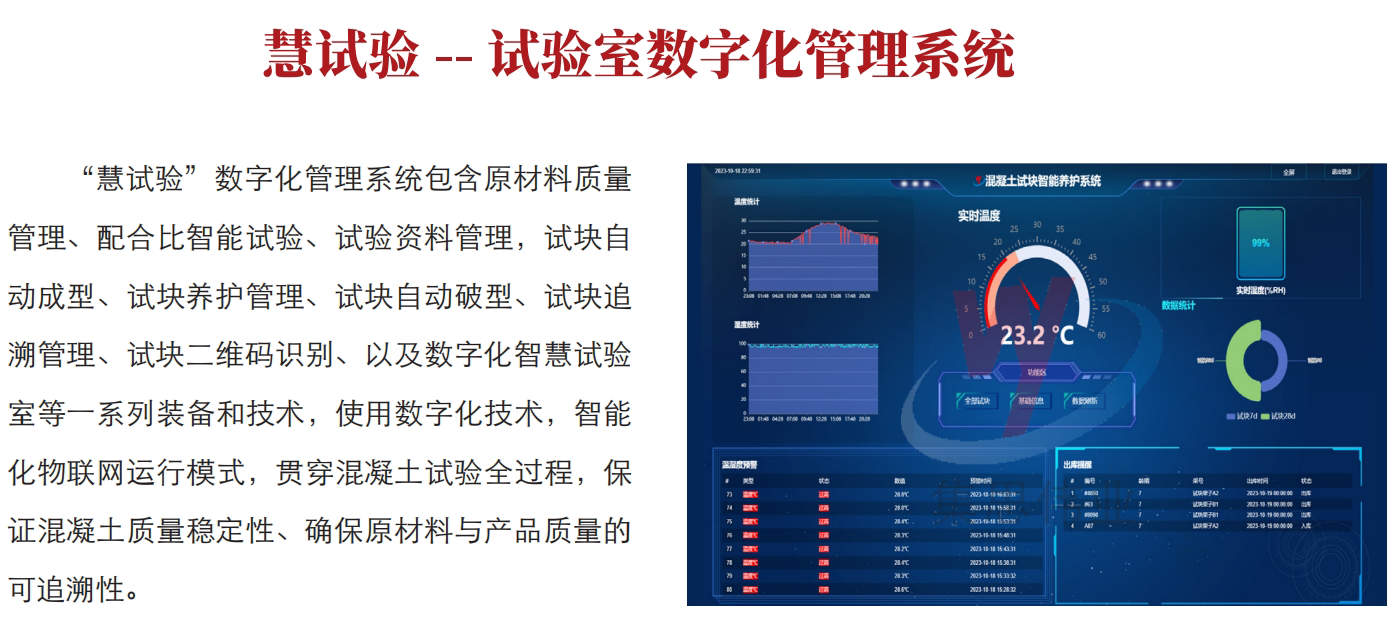 試驗室數(shù)字化管理系統(tǒng)包含原材料質(zhì)量管理,試驗資料管理,試塊自動成型,試塊養(yǎng)護管理,試塊自動破型,試塊追溯管理,試塊二維碼管理等貫穿混凝土試驗全過程智能化管理