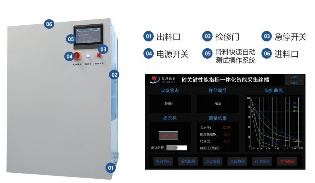 砂關(guān)鍵性能指標(biāo)一體化智能采集終端實現(xiàn)快速自動測試骨料含水率,細(xì)度模數(shù)的一體化智能設(shè)備,其具有操作靈活,自動測試,智能分析,數(shù)據(jù)精準(zhǔn)等特點